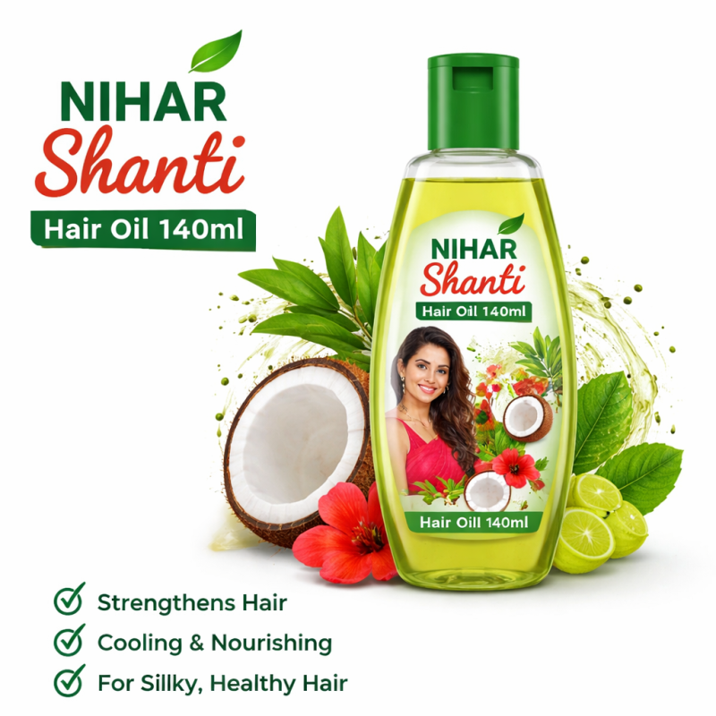 Nihar Shanti Hair Oil 140ml ek high-quality coconut based hair oil hai jo baalon ko deep nourishment aur natural shine deta hai. Iska cooling formula scalp ko relax karta hai aur hair roots ko strong banata hai.