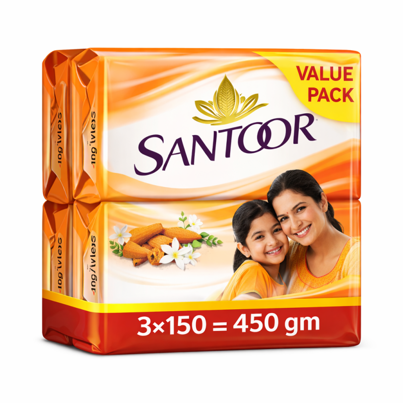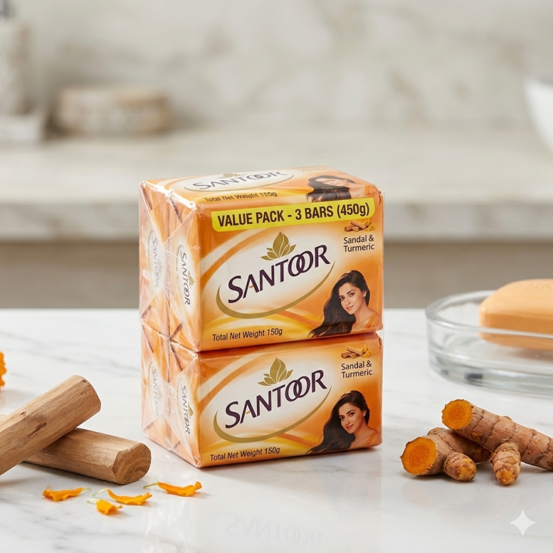 Santoor Soap bharat ka ek bharosemand brand hai jo barson se twacha ki khoobsurti ko barkarar rakhne mein madad kar raha hai. Iska khas formula Sandal (Chandan) aur Turmeric (Haldi) ke mishran se bana hai, jo twacha ko gehrai se saaf karta hai.