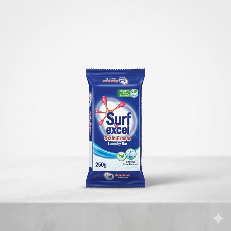 Surf Excel Laundry Bar apne "Stain Eraser" formula ke saath kapdon se tel, masala, aur mitti ke ziddi daag asani se nikaal deta hai. Yeh bar kapdon ke fiber ko nuksan pahunchaye bina unhe naye jaisa saaf aur khushbudar banata hai.