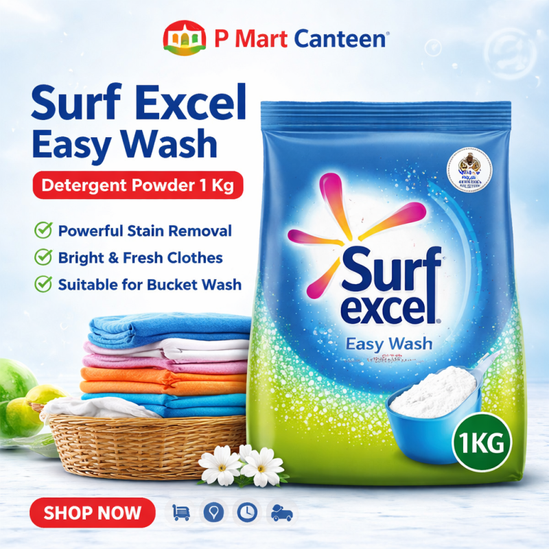 Surf Excel Easy Wash Detergent Powder 1 Kg kapdon ke ziddi daag ko aasani se hataane ke liye specially formulate kiya gaya hai. Iski powerful cleaning technology kapdon ko gehraai se saaf karti hai aur unki chamak barkarar rakhti hai.